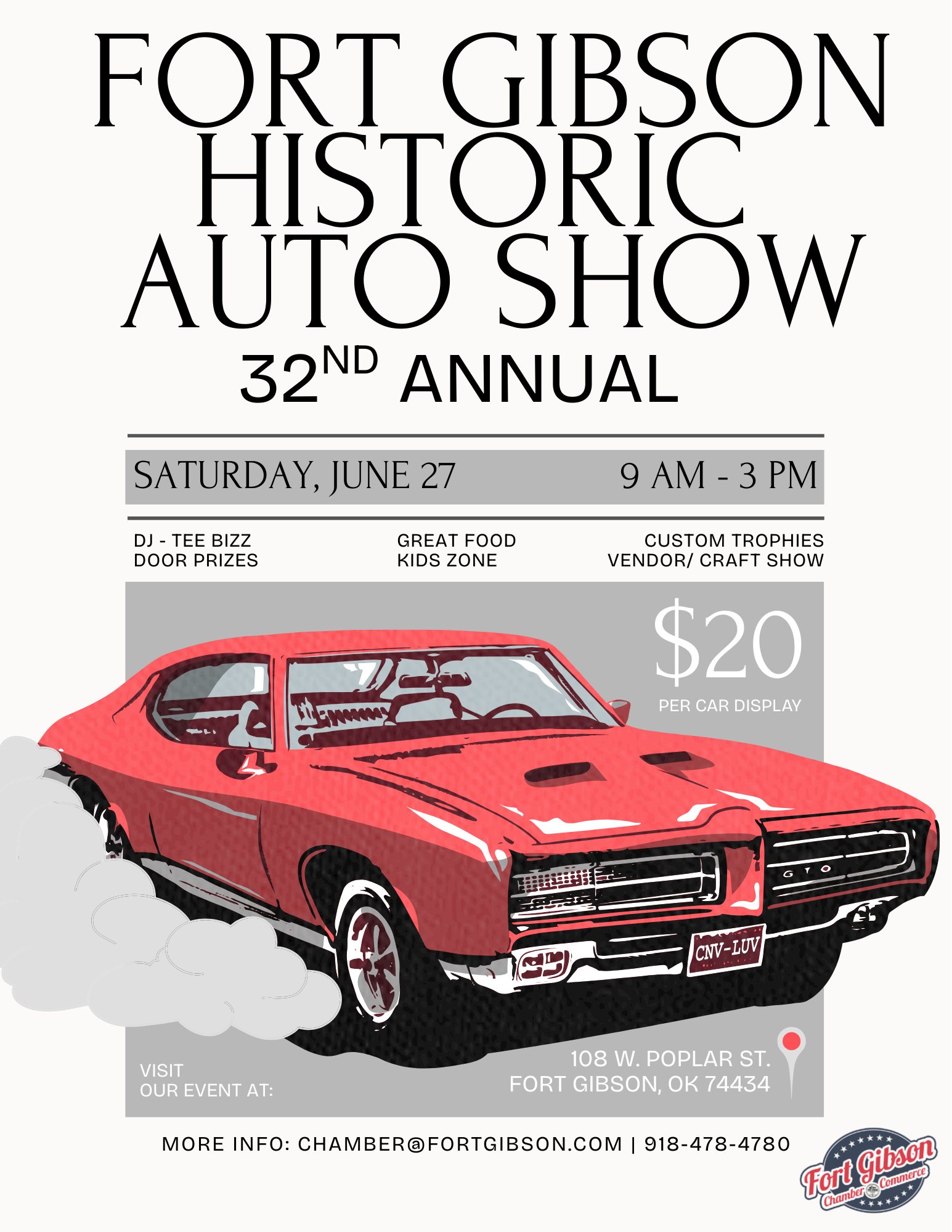Mark your calendars for Saturday, June 27, 2026! The Fort Gibson Historic Auto Show is back again featuring over 100 classic cars, custom trophies, and hired out-of-town judges.